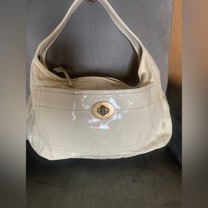 Beautiful Coach Leather Hobo from the 2007 Ergo collection. In white patent leather, clean classic design. Top zipper closure with leather pull. Front pocket with turn lock closure. Bag shows some wear and tear. Small exterior and exterior stains throughout. Some discoloring on underside of handle and faint discoloration throughout.