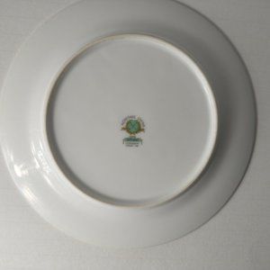 Border aquamarine and yellow scrolls and hints of white. Multicolored floral bouquets dominated by a large pink rose with more yellow scrolls encircle plate on the cream background to aqua line. The very center of the plate is a very white shade.