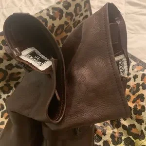 FRYE BURGUNDY BROWN LEATHER BOOTS, SIZE 6.5, GOOD CONDITION, VERY MINOR SCRATCHES ON BACK.