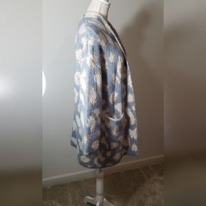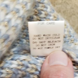 This is a new without tags women's S cardigan sweater by Davi&Dani. This is a wonderfully dense sweater perfect for chilly days and coffee get togethers. Light blue background with cream designs. Gold threading and occasional sequins surround each cream design, giving just a hint of bling without going overboard.