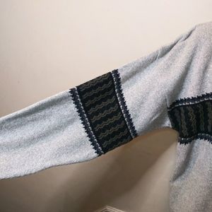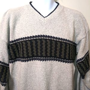 EUC Vintage gray and white oversized marled V-necked sweater with navy trim around the neckline, cuffs, and hem, from Liberty Sweaters. Sweater also has a wide 3-D multi/wavy stitch stripe in shades of navy, olive and blue, across the chest and sleeve. Chest measures 23, waist 21 1/2, hem 21 1/2, length 26 1/2 inches. Please see all photos.
