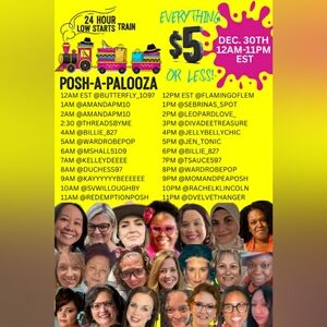 Good Evening Posh Family! Starting at 12AM EST the 24 hr Posh-A-Palooza 24 hr Marathon will begin. Every seller on this train will have $5 or less starts ALL DAY LONG. I go on @ 6AM EST/3AM PST. Be sure to check out this train multiple times- there is something for everyone. I will be showcasing Tops, Bottoms and Athleisure by request! If you need anything I have sizes 0 to 44 available. Please reach out and let me know! Have a Blessed New Years 🙏. Thank you for your support!!