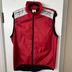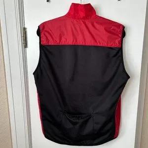 Red cycling vest with black fleece lining - wind resistant in the front and breathable in the back with one back pocket. It is in good condition.