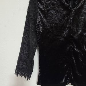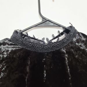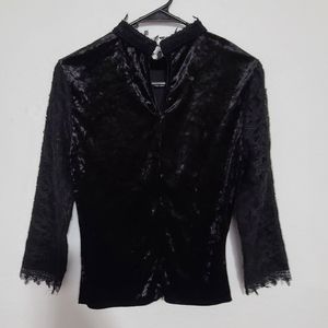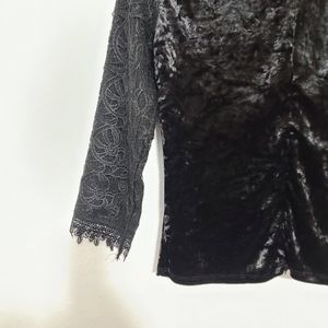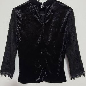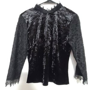 moon river by anthro black top the body is black velvet and sleeves and neck are black lace. back zipper 2 hook and eyes at neck one is missing no other flaws. gorgeous top