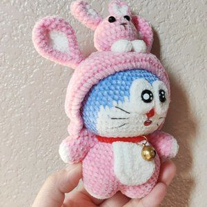 Handmade Amigurumi Crochet Doraemon Wearing a Bunny Hoodie