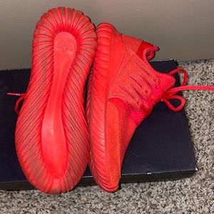 Super cute limited edition all red Adidas Tubulars. Only worn a few times. Small circle dirt spot on the front left shoe (pictured), but definitely would be able to get out. Super comfy and so so cute! Fits a size 7.5 women’s, size 5.5 men.