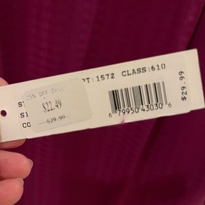 This blouse is a beautiful fuchsia. It has a silky textured window pane pattern . I only wore it twice. It was just a little too big for me. My loss is your gain!