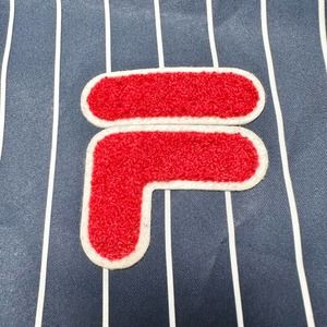 Pre-owned women’s Fila pinstripe snap button baseball track jacket with large Fila logo.