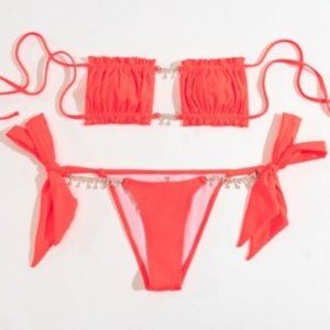 Stasia Booblicious Neon Coral Dangling Rhinestone Charm String Bikini