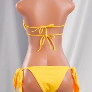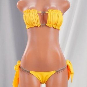 The Stasia Booblicious: Dangling Rhinestone Charm String Bikini Swimsuit is flirty and fun. It has a jeweled padded tube top with a drawstring ruched halter neck and side ties.