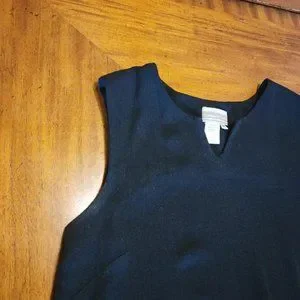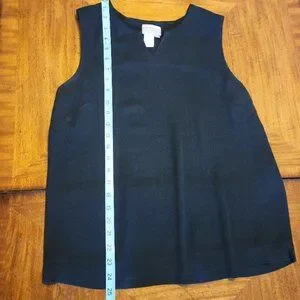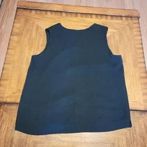 Color is deep black; small cut out V at neckline; sleeveless shell; pull on; small slits on bottom sides.
