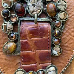 Leatherock brand purse. Crossbody or shoulder wear. It has a stamp of maker inside but I havenβt been able to solve the mystery. Today I found it!!!!!β ππ»ππ»ππ»ππ»ππ»ππ» Leatherock brand. πIn VERY great condition. Clean, no flaws. Beautiful stones and detail on this purse. It will catch eyes for sure. Non smoking home. Please message me with any questions or concerns. Itβs been tucked away for 10 years in a dust bag. Iβve conditioned it and cleaned once a year. Thank yaβll for checking my items out!!
