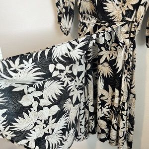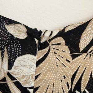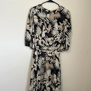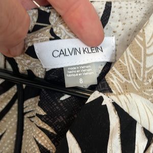 Dress from Calvin Klein dress black, tan and white cute leaf design. It is a wrap dress. No tags but never worn. It still has the extra button tag attached.