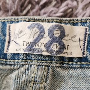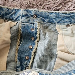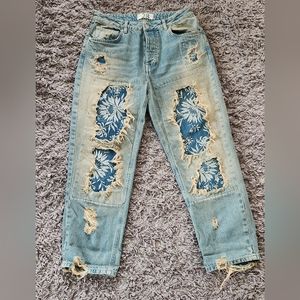 features: floral, distressed, embroidered, high rise, 100% cotton, bohemian chic, 4 buttons, back pockets, no stretch