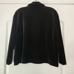 Ribbed plush polyester women's black shirt in excellent condition. Size Petite Small measures 23 inches down the back middle from neckline seam to bottom and 22 inches across front chest from armpit to armpit. The sleeves are 17 inches long from underarm seam to end of sleeve.