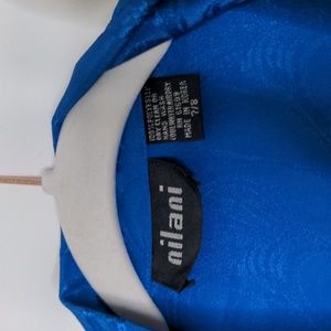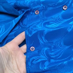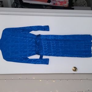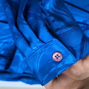 GORGEOUS vintage 80s boss lady style long sleeve cobalt blue button up midi knee length dress, size 7/8 or medium 😍 silky satin feel & look. beautiful pleated skirt that moves like 🤤 functional front chest pockets. shoulder pads in full effect. shimmery paisley design. matching wide belt to finish the look. PERFECT condition - seemingly NWOT.