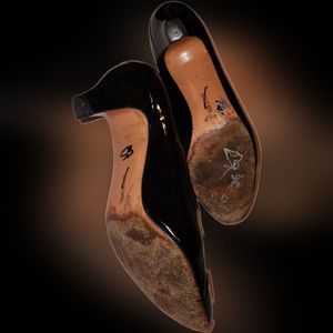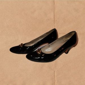 Salvatore Ferragamo Barbie Black Shiny Pumps with Gold Decal Women's 7.5