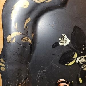Vintage 1950's Metal Tray Hand Painted by Numbers Apprx. 18.5" x 14.75". Made in USA. The "artist" was clearly a minimalist and did not fill in all the suggested outlines, you can see the darker shadows on Tray of the original full design. Or maybe she just ran out of time or paint. Regardless it's still a beautiful shabby chic Tray to use or display. Scratches from normal use. Minimal corrosion. Very solid and heavy. Super pretty!