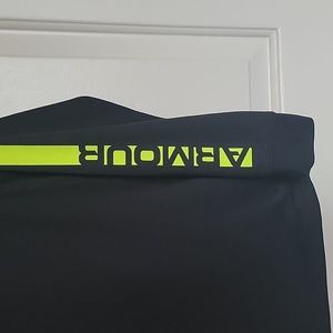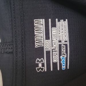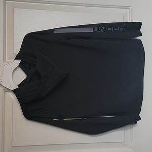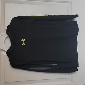 Under Armour, boys medium, loose fit, long sleeved black shirt with hood, Coldgear. All black except for neon green accents. Two front hand pockets. Very gently used, like new condition.