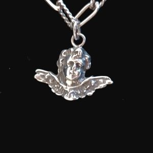 Vintage Foreé Hunsicker Sterling Silver Necklace Engraved Luggage Tags & Cherub