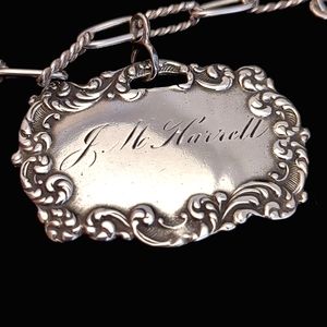 ~ Overview: Rare collector necklace by Foreé Hunsicker featuring five engraved sterling silver luggage tags and two detailed cherub charms on an alternating smooth and rope oval-link chain. Each tag displays repoussé-style decoration with unique engraved initials or names, adding historical and personal character. Finished with a secure hallmarked hook clasp, this substantial piece reflects exceptional craftsmanship and heirloom-quality design.