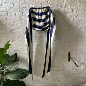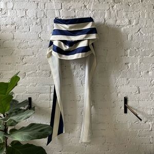Off the shoulder blue and white striped satin blouse with long sash. Fitted elastic around the bust; the blouse drapes away from the waist.