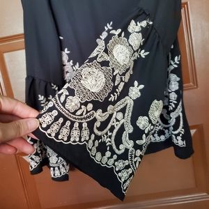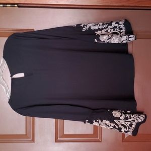 Maurices Black and White Floral Top Bell Sleeves Size M. This shirt is gently preowned, it is missing the ties on the sleeves but the loops are still there. it is still a very wearable shirt. It measures 20 inches pit to pit, length is little over 25 inches, arms measure 24.5 inches and a little more.