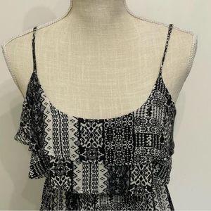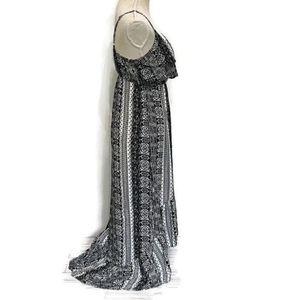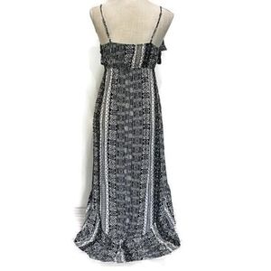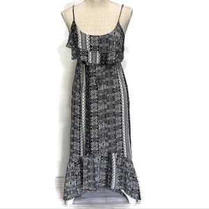 Mudd Y2K 90s Empire Waist Black & White Floral Paisley Ruffle Hi-lo Maxi Dress; M 100% Rayon Adjustable spaghetti straps w/ clear hardware; Sleeveless Ruffles front top ,empire waist w/ elastic waistband Frills ruffles on the hemline White and black pattern