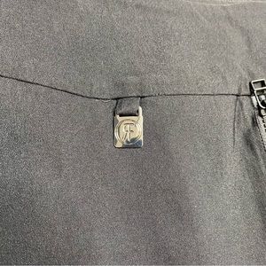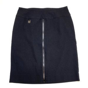 Excellent condition Raffinalla Black Zipper Front Pencil Skirt. Rayon / nylon / spandex fabric blend. Function full black zippered front accent. RF logo pendant at hip. Unlined. Style S228P-70.