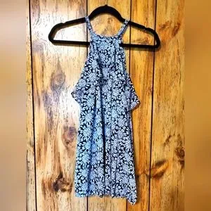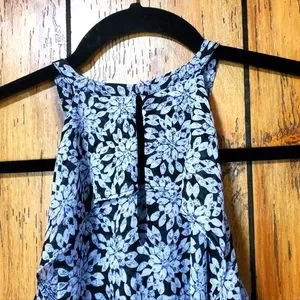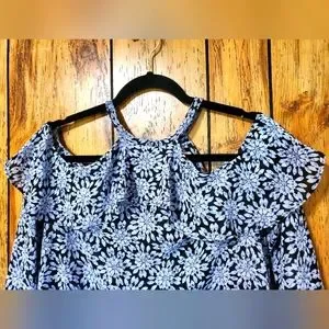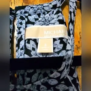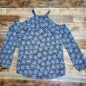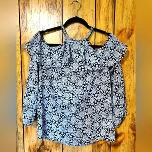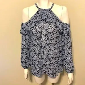 Michael Kors Cold Shoulder Sheer Halter Jewel Print Top SMALL Ruffles. Very Flowy, beautiful lightweight top. Gray and black with blue hues, floral/diamond pattern. Elastic cuffs, ruffled top edges, buttons at neck on back with keyhole opening.