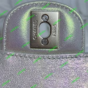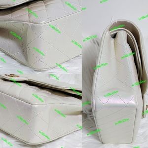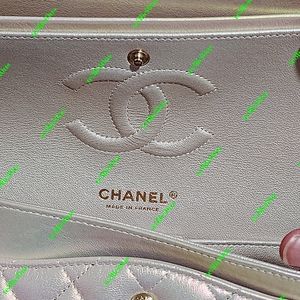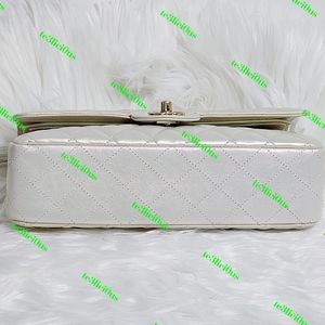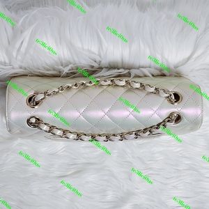 This Medium Classic Double Flap bag is in IRIDESCENT Ivory lambskin leather with light gold tone hardware and features a front flap with signature CC turnlock closure, half moon back pocket, and adjustable interwoven light gold tone chain link and olive leather shoulder strap.