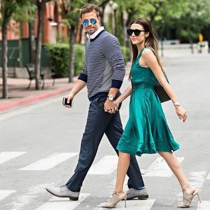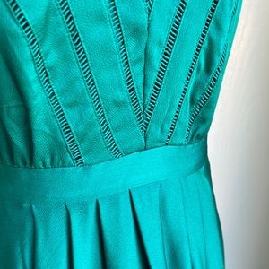 This is one of my favorites. I loved it so much, I bought four (two in blue, one in green, one in a blue and red pattern). Unfortunately I outgrew them before getting a chance to wear them. 😭 This one is gorgeous, simple, sophisticated and flattering. I felt like Audrey Hepburn when I tried it on. A perfect A-line dress! Like new condition. Beautiful details like the hemstitching on the bodice and hem. A gorgeous emerald green that Banana Republic calls “cosmic teal”. Size zip. Flat measurements are approximately:
