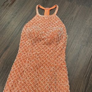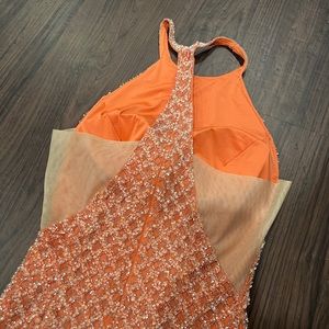 Beaded cocktail dress with a high halter-style neckline and illusion cut out sides.