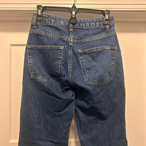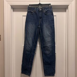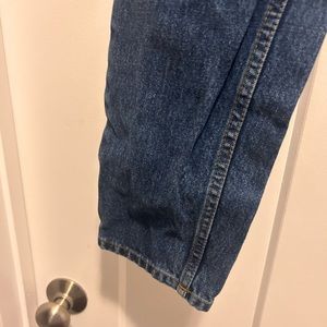 Medium wash 90’s fit jeans, high rise with slightly tapered leg. Great condition, dark wash with lighter fading on the highs.