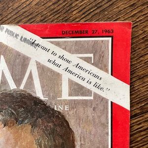 TIME magazine December 27, 1963. Step back in time 60 years. Magazine is in read condition. It was a library copy. Shows signs of having been well-read. Pages are yellowed with normal aging. Was stored in a box that perhaps was exposed to moisture at some point in time. There is no water damage, but magazine does not lay completely flat. Sold AS IS - ask questions.