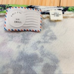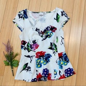 Beautiful floral short sleeve top by Anthropologie brand Postmark 9-H15 STCL, size small. Off-white background with bright watercolor floral and ink design. Soft and stretchy. Bust measures 17 inches across unstretched, link measures about 23.5 inches. Peplum ruffle. Super sweet.