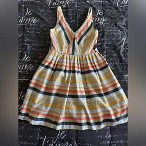 Gorgeous dress by J.Crew! Features pattern of denim, orange, and metallic gold stripes. V-neckline, a-line skirt, hidden pockets, side zipper. Dress is fully lined. Please note there is a small tear above the left side pocket, but due to the full skirt it is not noticeable. Easy to sew back up, just never got around to having my seamstress do it! Good used condition with mild wear under armpits. Size 8 measures approximately 17.5 inches flat pit to pit, approx 15.5 inches flat across waist, and approximately 35 inches from top of dress to bottom of dress. 56% cotton, 36% polyester, 8% other fibers. Perfect for holidays, new years, and any party look!