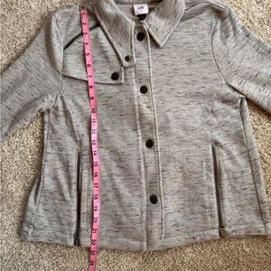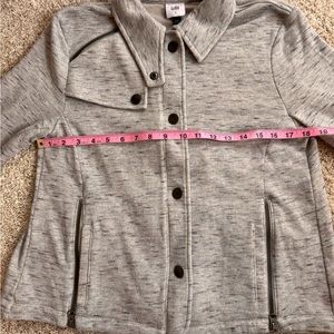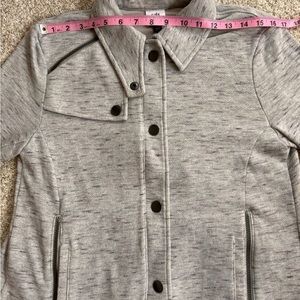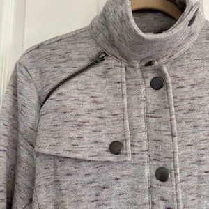 This is a beautiful and super comfortable zip-up jacket that comes in a heather taupe hue and has a fold-over collar with snap buttons and zipper detailing throughout. This varsity-style topper has a sweatshirt feel with moto jacket embellishments, has an easy fit, and hits at the mid-hip, it features a swing shape at the back with slash pockets. Made of a medium-weight French Terry Fabric is 57% Cotton and 43% Polyester. EUC.