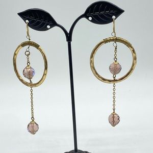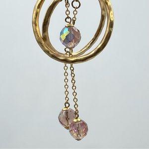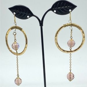 Hammered Gold Tone Hoop Earrings AB Pink Crystal Drop Bohemian Chic Boho Dangle