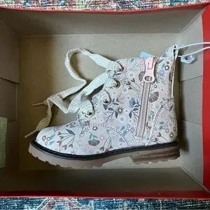 Toddler girl’s mid-height boots. Floral pattern with pinks and neutrals. Sparkly laces. Zip up side for easy on/off.