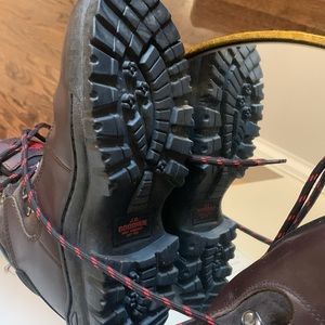 The upper is full grain leather and the double density polyurethane rubber sole is slip-resistant. Boots are steel toed, also feature a plush collar and tongue with logos. There are pull on tabs at the back for easy on and off, round lace up grommets with speed lacing at the ankle shaft.
