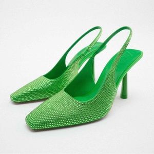 Zara rhinestone slingback heels in bright green!! New with tags, super sparkly in person!! As seen on bloggers and sold out!! Perfect for any event!
