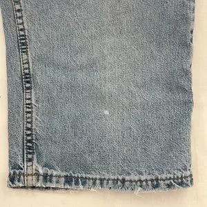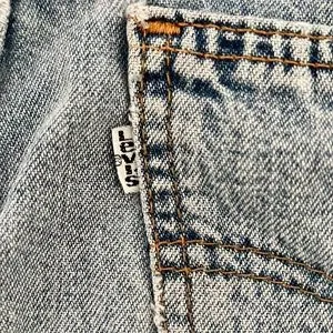 Vintage Condition / 1970โs~White Levi Pocket Tab / Blue; high rise; button and zipper; wide leg; 5~pockets. White Tab, not seen too often. White Tabs were used for corduroy pieces, but white Tabs were also used in the 60s and 70s for Levi's Gals collection. Distressed on hemline with small light dot on left leg.