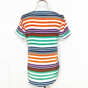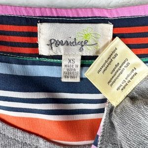 Style tags: Womens shirt, blouse, pullover, pull over, knit top, shirt, tee, tshirt, t-shirt, t shirt, short sleeve, retro, nautical, coastal, minimalist, circus core, artsy, artisan, striped, stripe, pinstripe, ombre, ombré, mixed media, patchwork, graphic print, casual, office, work, business casual, vacation, resort, resort wear, gray, pink, hot pink, blue, navy, navy blue, baby blue, orange, white, rainbow, printset, print set, anthro, anthropologie, porridge, size xs