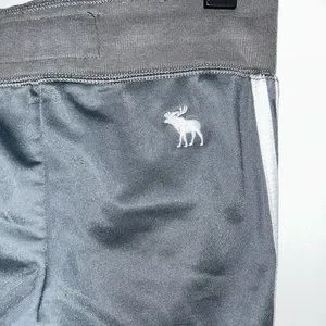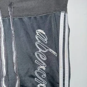 100% poly in dark gray with applied white knit stripes on outer legs