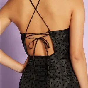 NWT black dress from ModCloth. Bit of a mermaid silhouette. Velvet dots on the sheet overlay. Tie back closure and side zipper. Size m.