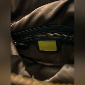 Two compartments, one with zipper and one with magnetic closure, hidden pocket under fold, butter soft leather and smooth pulling zipper. Like new! Never used!