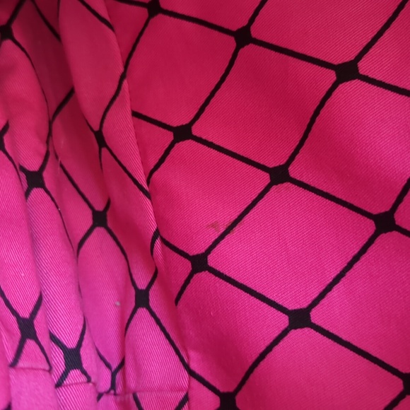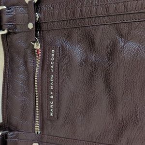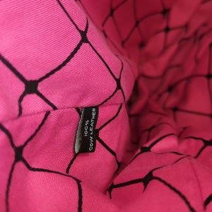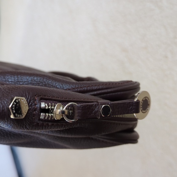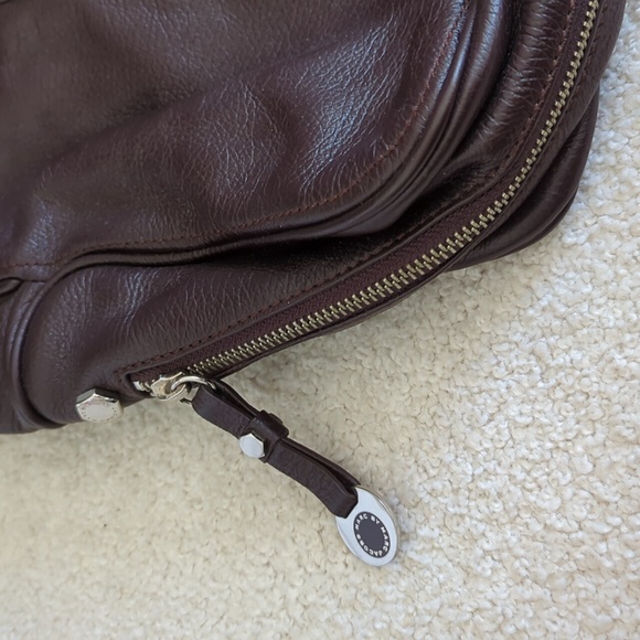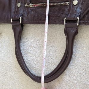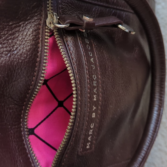 Soft pebbles leather, chocolate brown, full zipper closure, pink with black diamond print lining, silver hardware, zippers look like a brassy color, 1 outside zippered pocket on the front, 1 zippered pocket on the inside, 2 small pockets on inside- no zippers. The bottom has a zipper that expands the base just a little. small stain on interior, see pic.