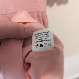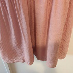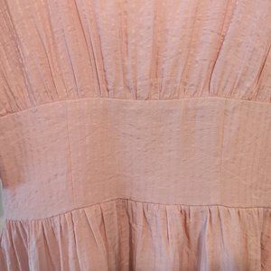 Adorable dress by Lovers + Friends! This dress is light pink in color and made with a textured fabrication. Subtle stripe details add dimension to this dress! Puff elastic sleeves, deep scoop neckline, fitted waistband, lined, back zip hook/eye closure.