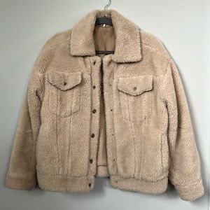 Oversized and slouchy trucker jacket featured in a fuzzy faux-sherpa.